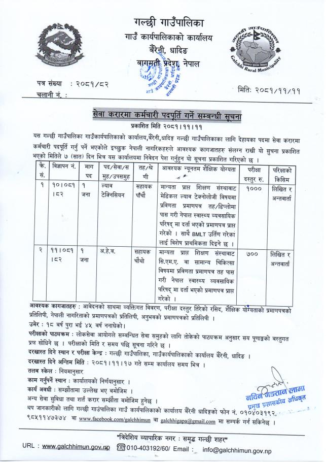 गल्छी गाउँपालिकामा कर्मचारी आवश्यकता सम्बन्धी सूचना