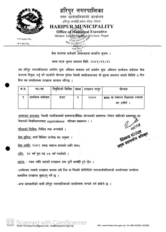 हरिपुर नगरपालिका सर्लाहीमा क्षयरोग मुक्त अभियान कार्यक्रमका लागि कार्यक्रम संयोजक करारमा लिने सम्बन्धी सूचना !