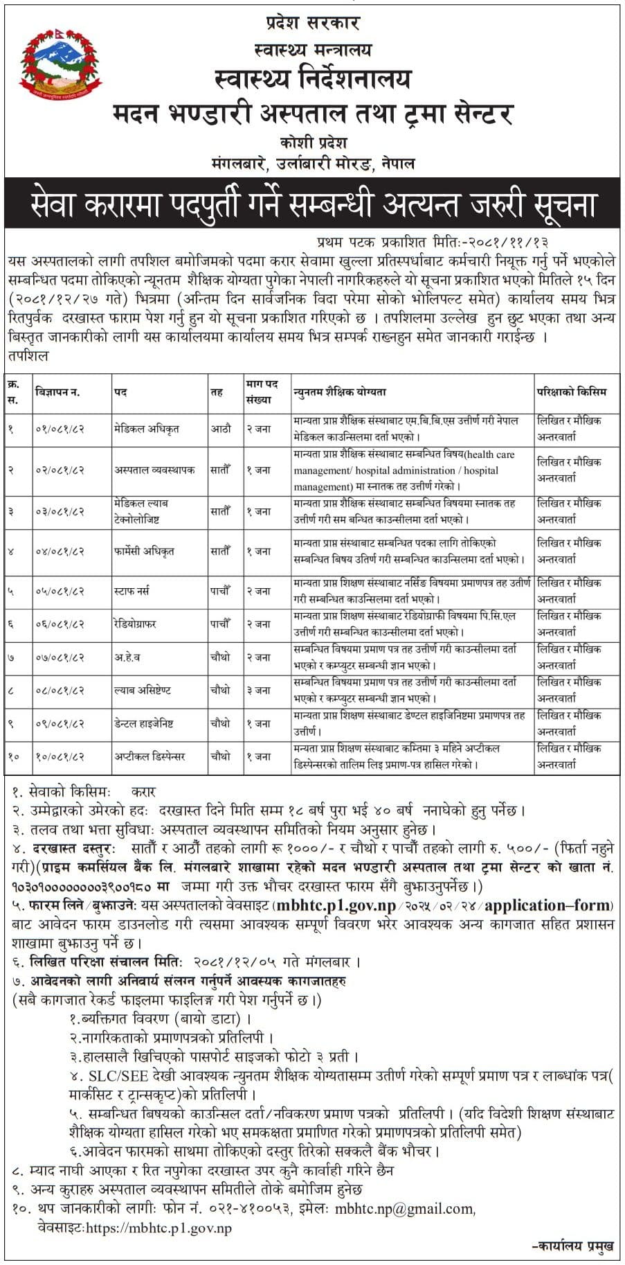 मदन भण्डारी अस्पताल तथा ट्रमा सेन्टरमा कर्मचारी आवश्यकता सम्बन्धी सूचना
