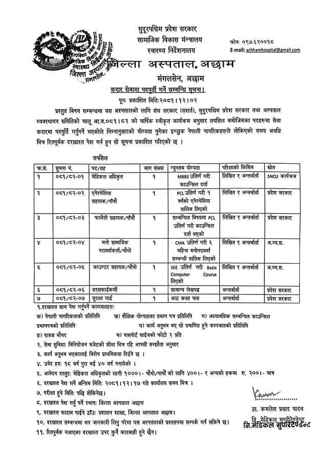 जिल्ला अस्पताल अछाममा करार सेवामा कर्मचारी चिकित्सक तथा स्वास्थ्यकर्मी आवश्यकता सम्बन्धी सूचना