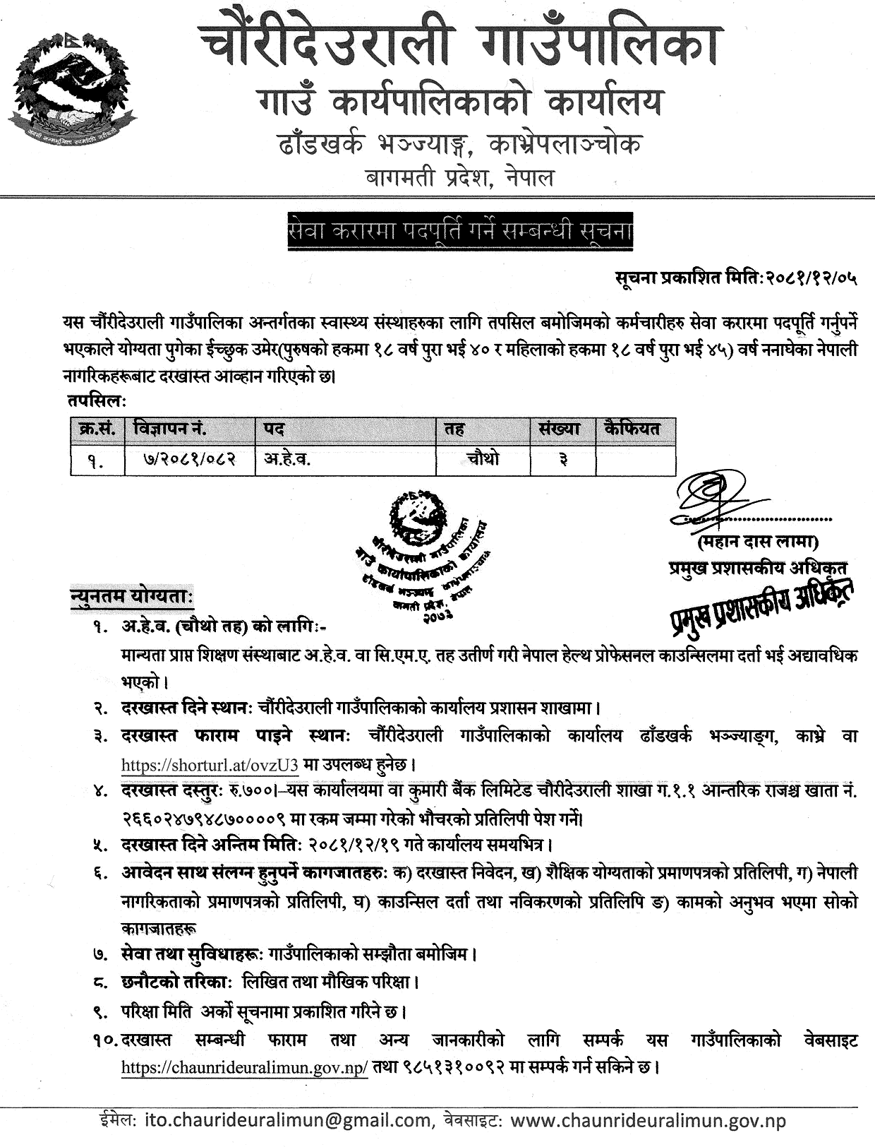Chaurideurali Rural Municipality Vacancy for AHW 2081-12-05