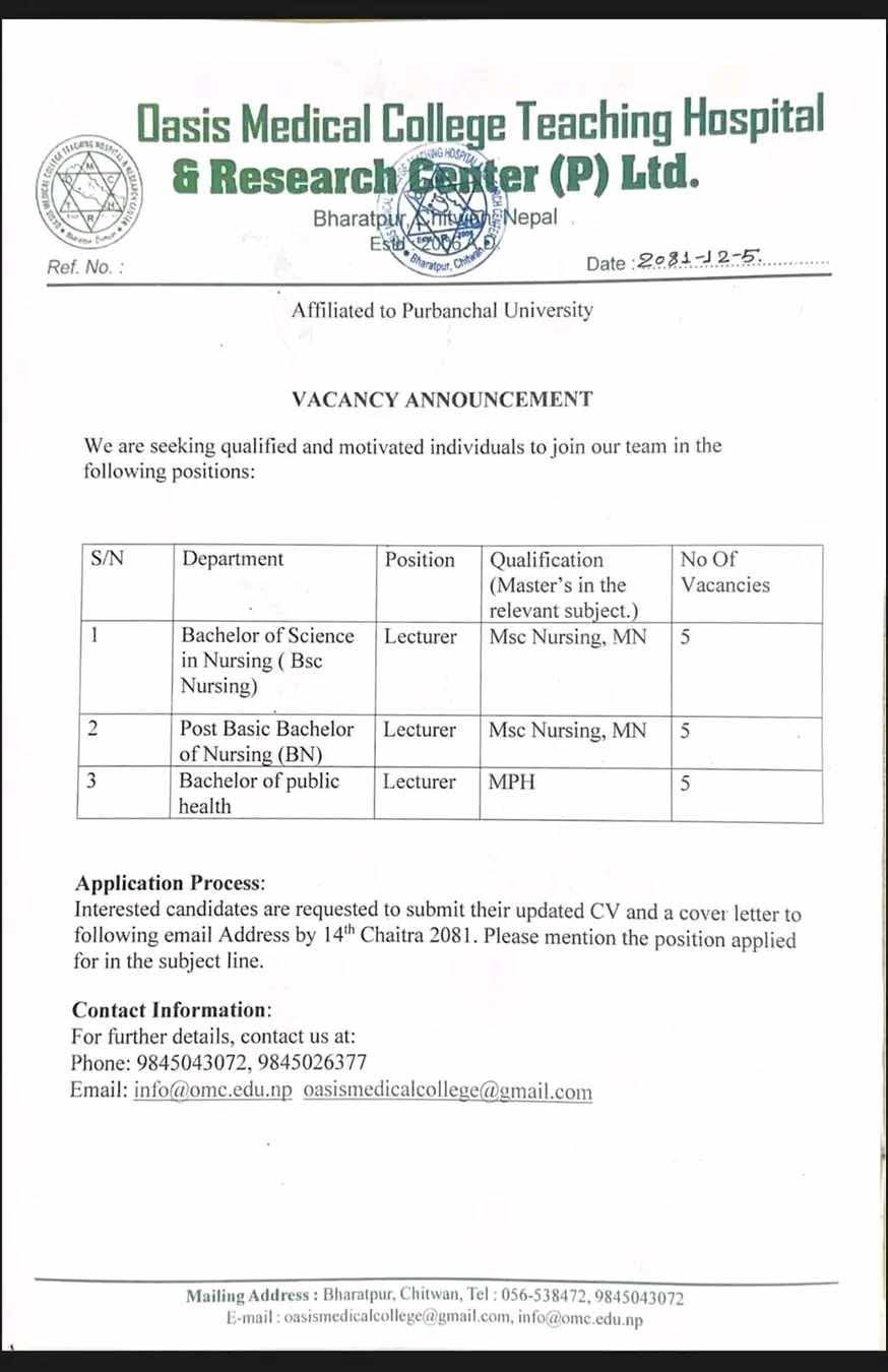 Vacancy Announcement for the various Post at Oasis Medical College Teaching Hospital and Research Centre Pvt. Ltd.