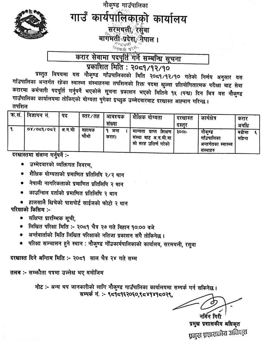 Naukunda Rural Municipality Vacancy for ANM Post