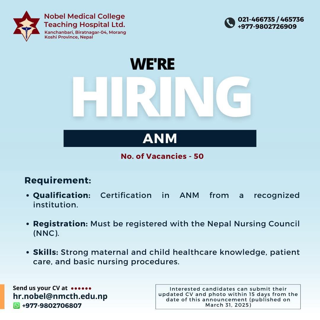 Nobel Medical College Hiring: 50 ANM Vacancies