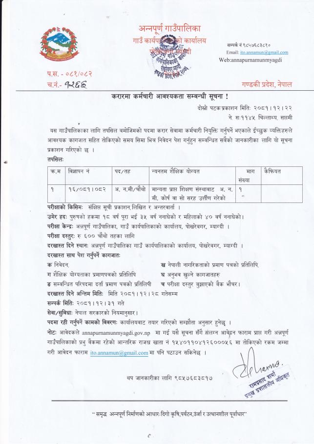 अन्नपूर्ण गाउँपालिका पोखरेबगर म्याग्दीमा अ.न.मी. आवश्यकता सम्बन्धी सूचना