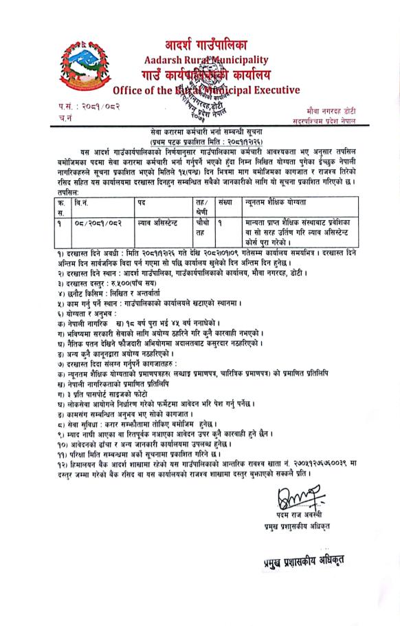 आदर्श गाउँपालिका डोटीमा ल्याब असिष्टेण्ट आवश्यकता