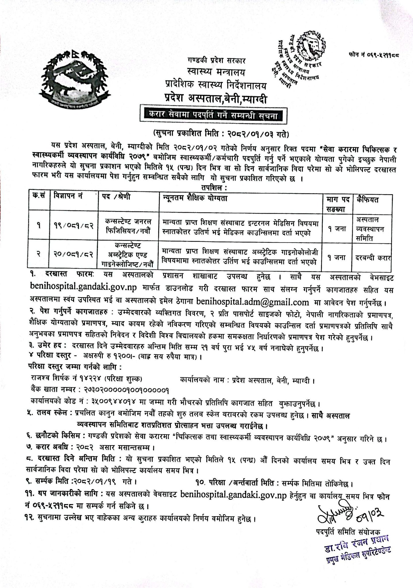 Vacancy Announcement at Province Hospital Beni Myagdi