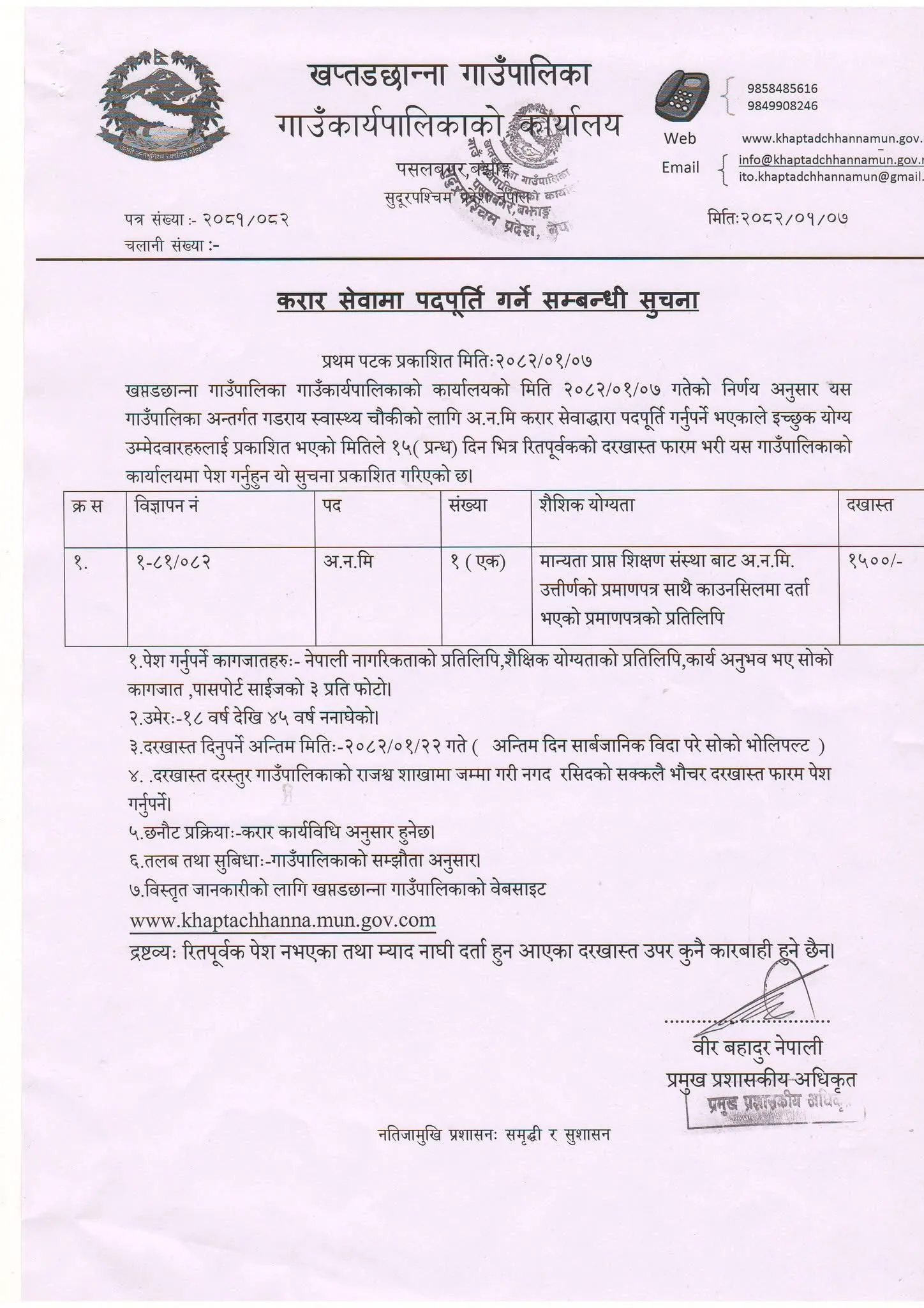 खप्तडछान्ना गाउँपालिका बझाङ्गमा अ.न.मी आवश्यकता सम्बनधी सूचना