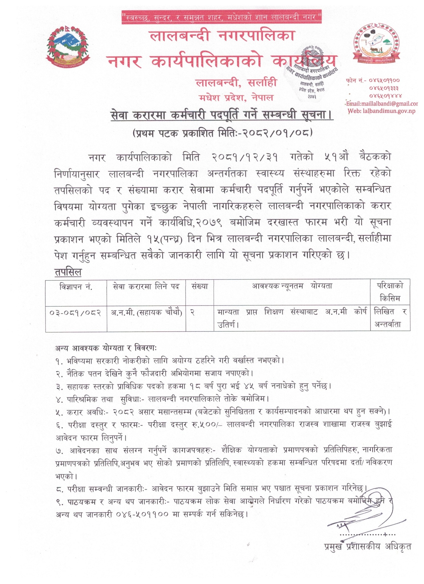 Lalbandi Municipality Vacancy for ANM