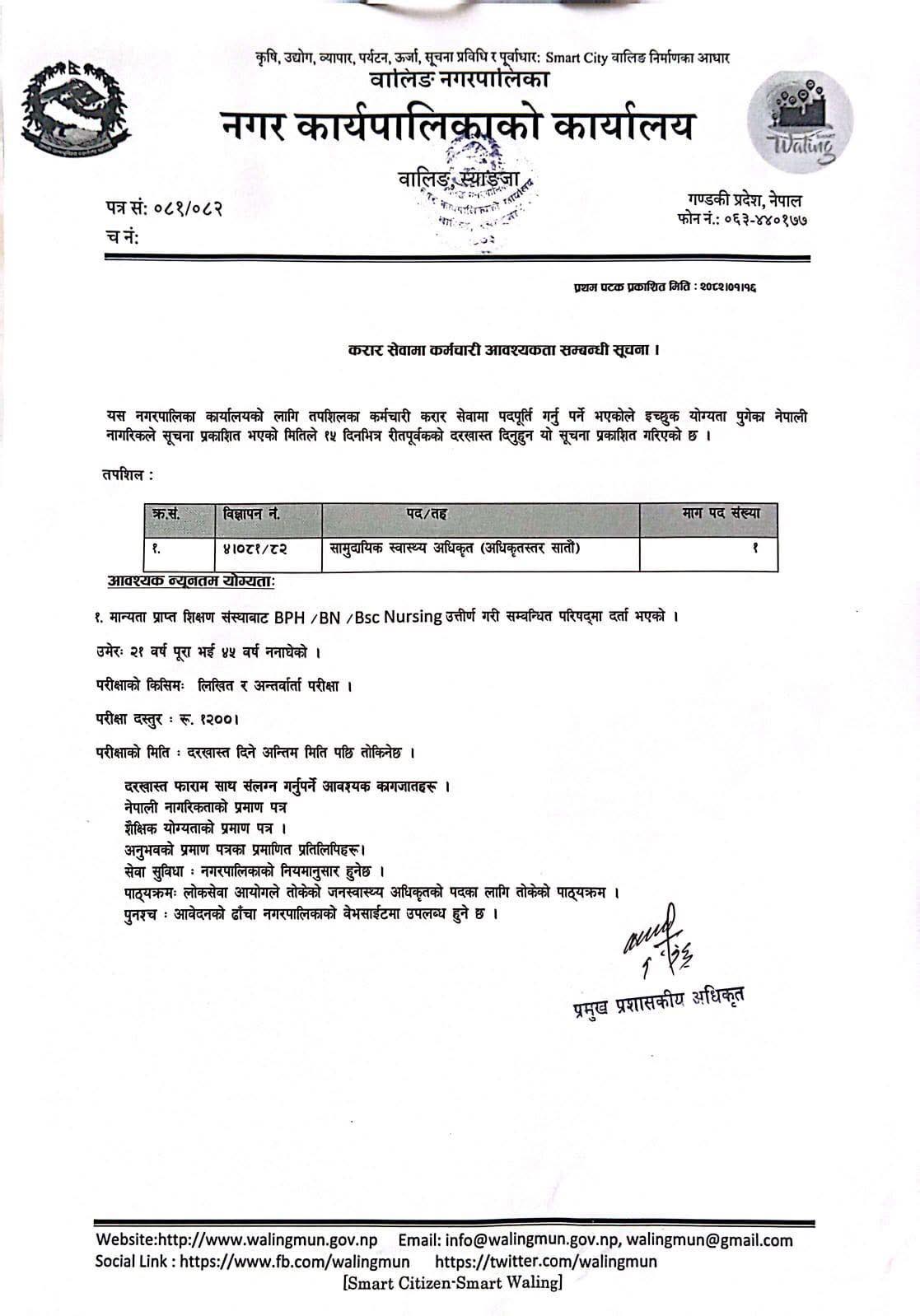 वालिङ नगरपालिका स्याङ्जामा सामुदायिक स्वास्थ्य अधिकृत आवश्यकता सम्बन्धी सूचना