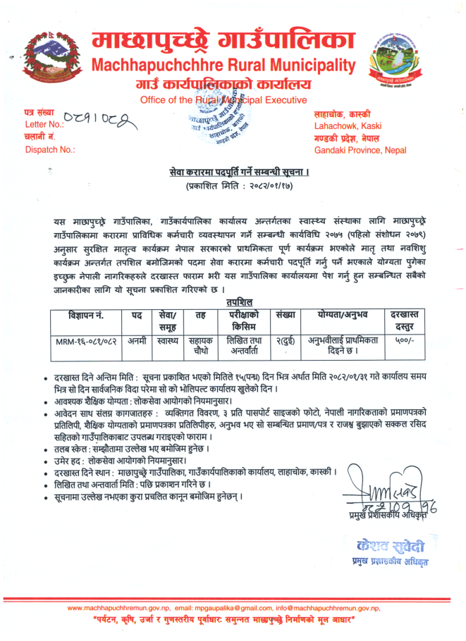 माछापुच्छ्रे गाउँपालिकामा अ.न.मी. आवश्यकता