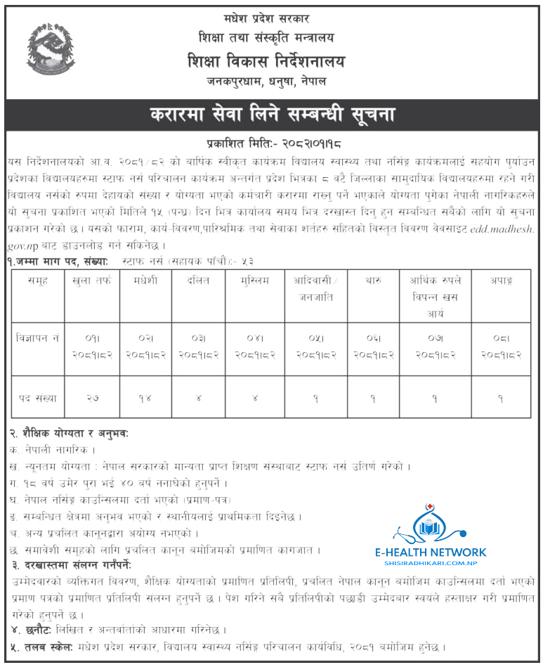 मधेश प्रदेश शिक्षा विकास निर्देशनलायमा ५३ जना स्टाफ नर्स आवश्यकता सम्बन्धी सूचना