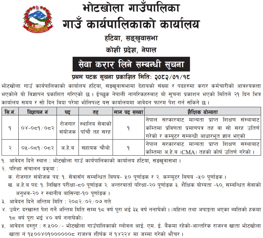 भोटेखोला गाउँपालिकामा कर्मचारी आवश्यकता सम्बन्धी सूचना