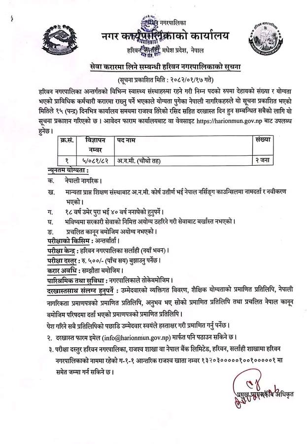 हरिवन नगरपालिकामा अ.न.मी. आवश्यकता सम्बन्धी सूचना