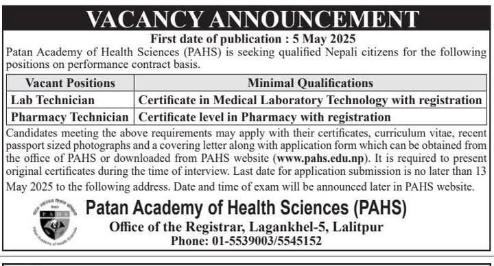 Vacancy Announcement for the Post of Pharmacy Technician and Lab Technician at PAHS