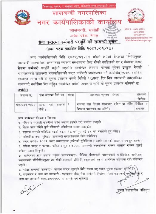 लालबन्दी नगरपालिका सर्लाहीमा विद्यालय नर्स आवश्यकता सम्बन्धी सूचना