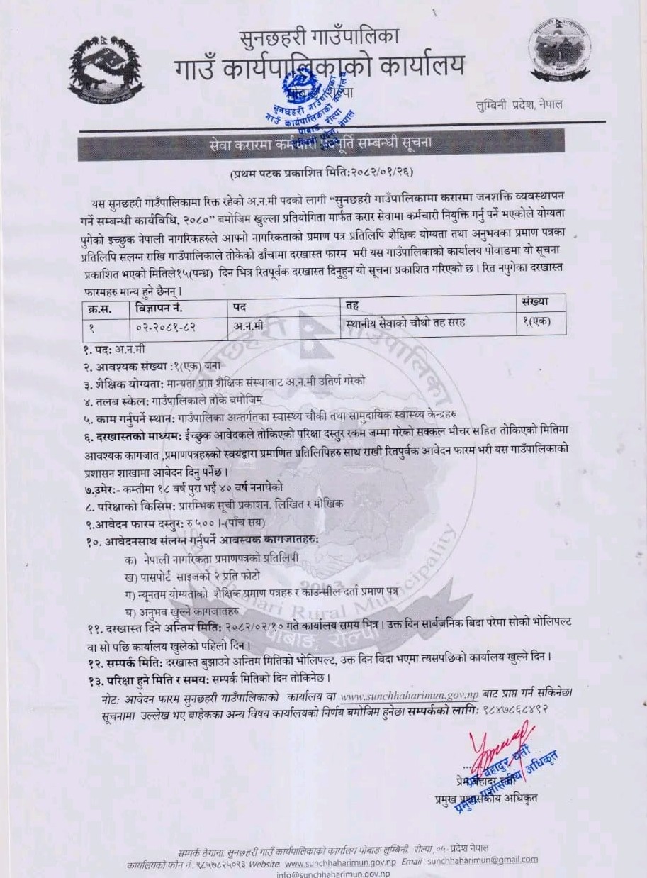 सुनछहरी गाउँपालिकामा अ.न.मी. आवश्यकता सम्बन्धी सूचना