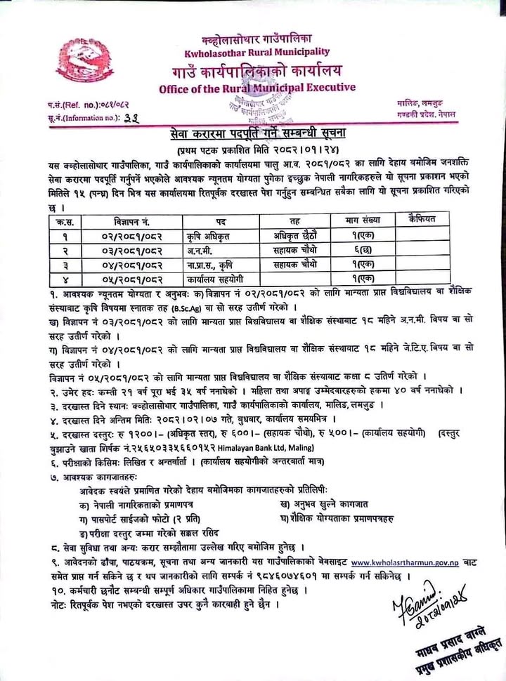 क्व्होलासोथार गाउँपालिका लमजुङमा अ.न.मी. (६ जना) लगायतका कर्मचारी आवश्यकता