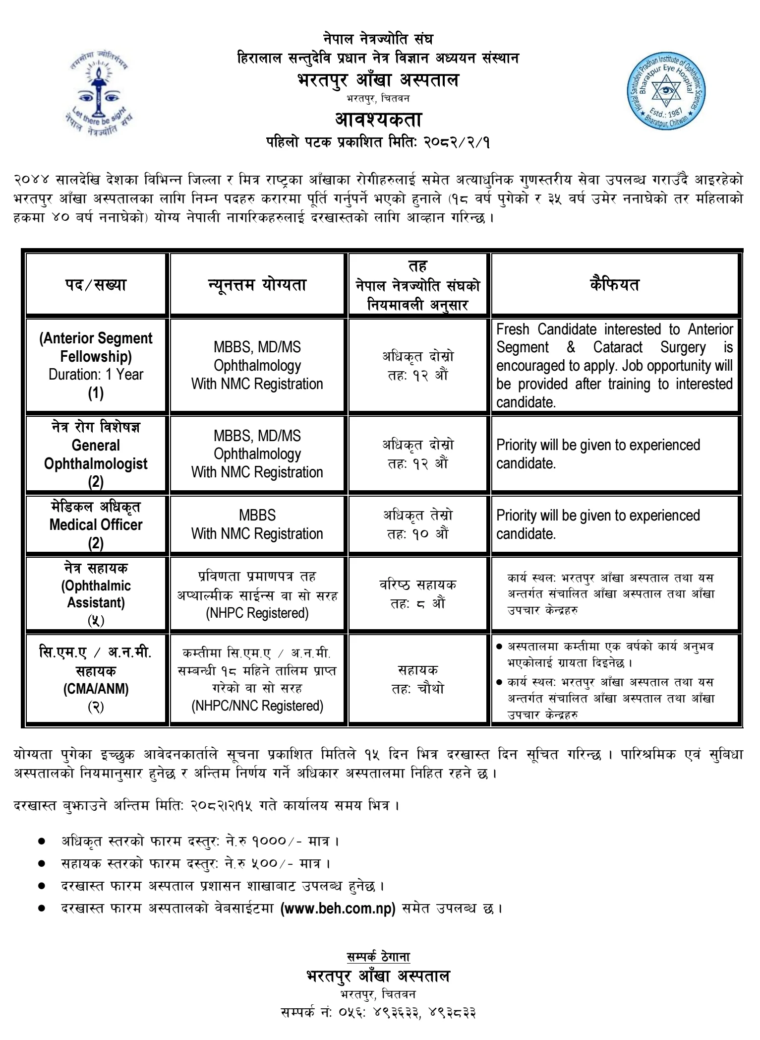भरतपुर आँखा अस्पताल चितवनमा चिकित्सक तथा स्वास्थ्यकर्मी आवश्यकता सम्बन्धी सूचना