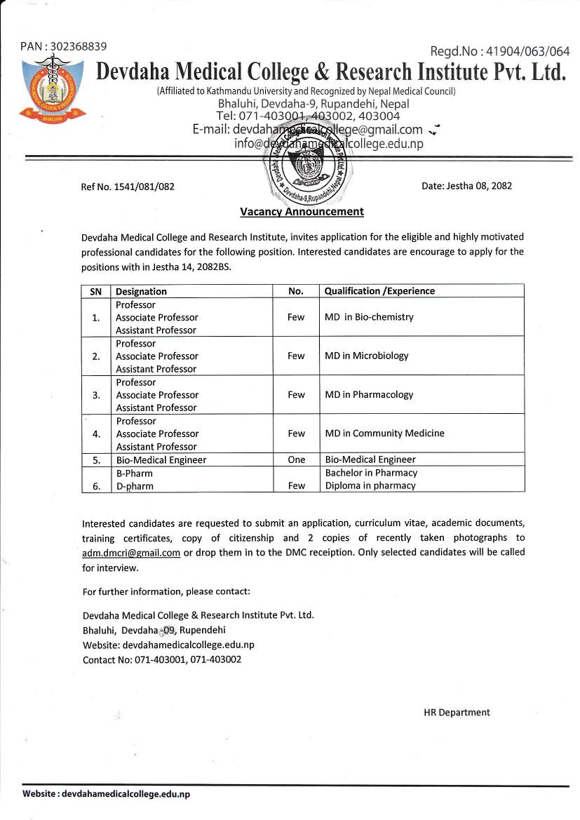 Devdaha Medical College & Research Institute Vacancy for Various Posts