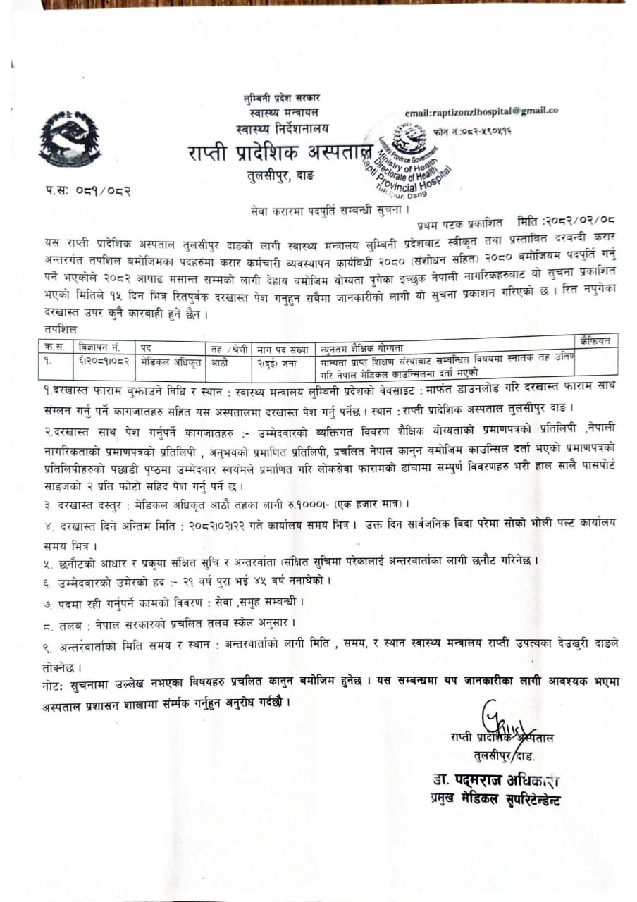 राप्ती प्रादेशिक अस्पतालमा मेडिकल अधिकृत आवश्यकता