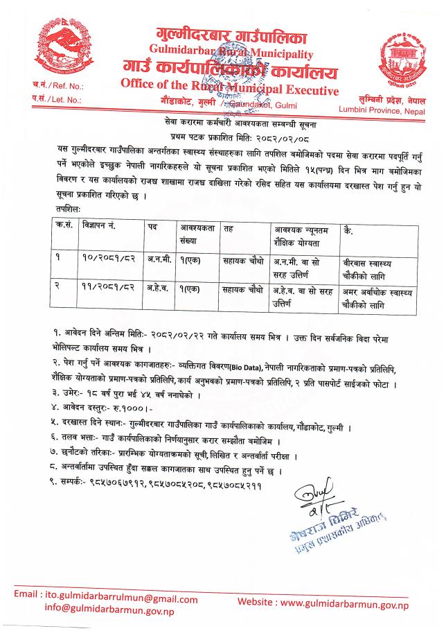 Gulmidarbar Rural Municipality Vacancy for ANM and AHW
