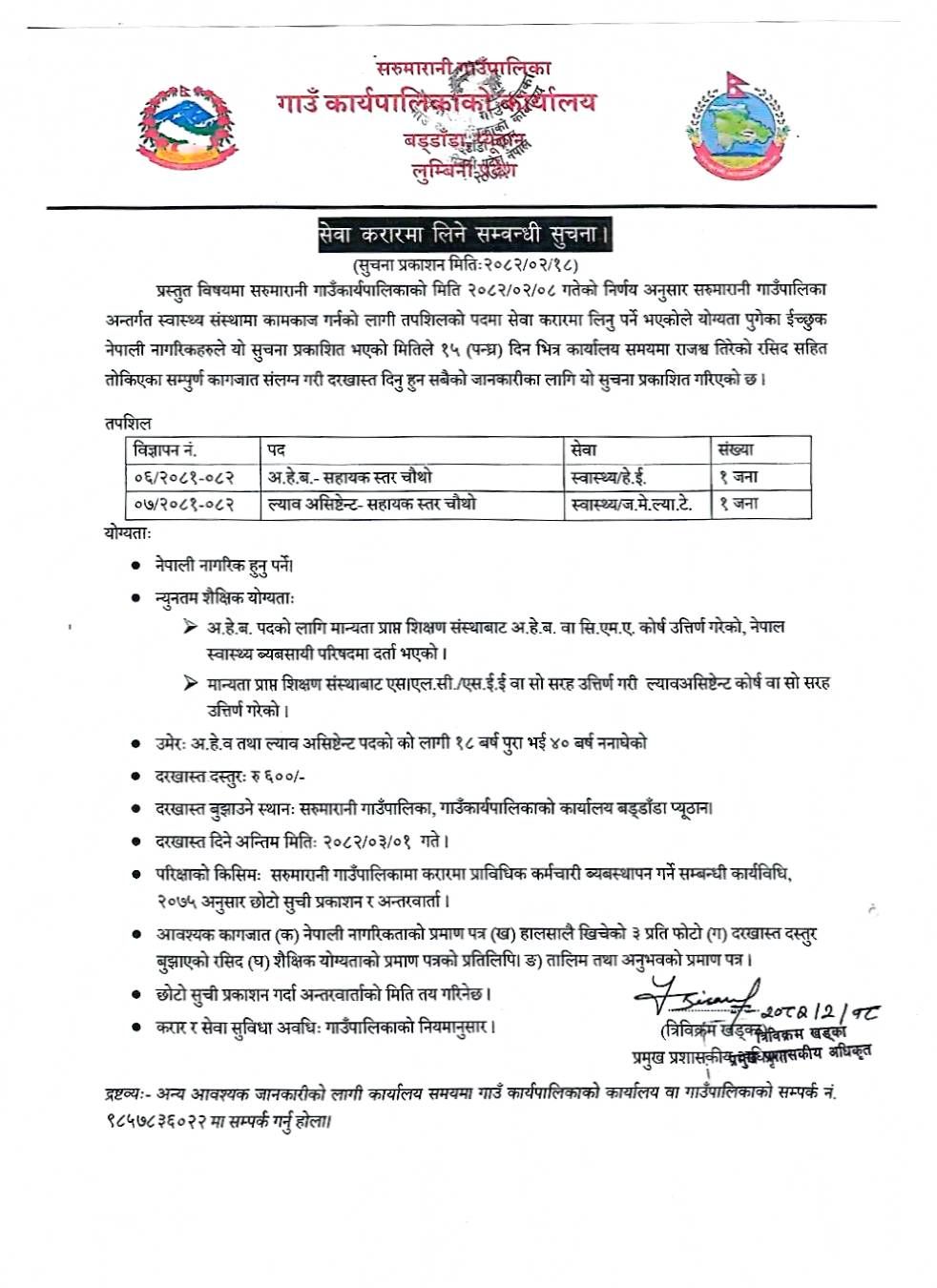 सरुमारानी गाउँपालिकामा स्वास्थ्यकर्मी आवश्यकता सम्बन्धी सूचना