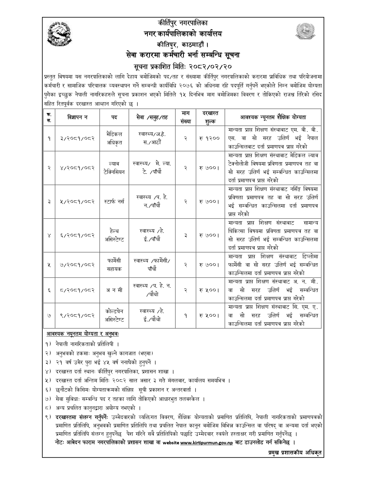 Kirtipur Municipality Vacancies for the Posts