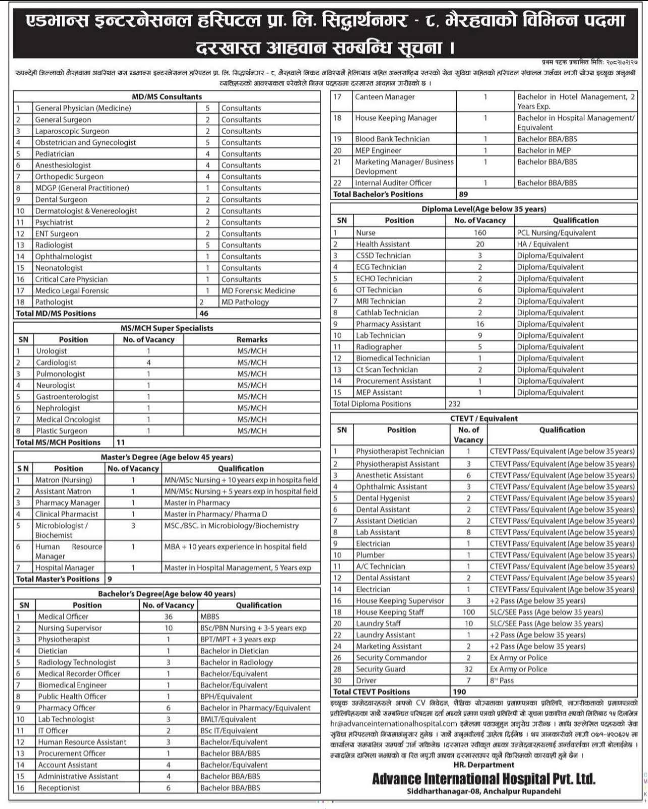 एडभान्स इन्टरनेशनल हस्पिटल भैरहवामा चिकित्सक, नर्स, पारमेडिक्स लगायत ५७२ कर्मचारी आवश्यकता