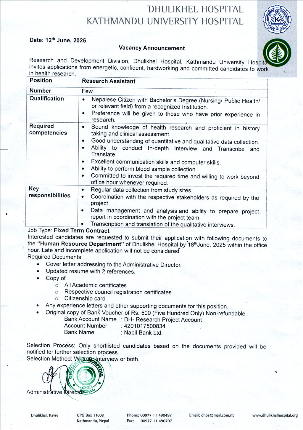 Dhulikhel Hospital Vacancy for the Post of Research Assistant (BPH/BN)