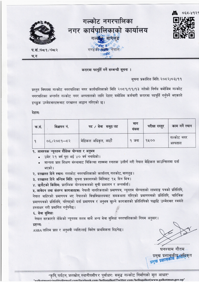 Galkot Municipality Vacancy for Medical Officer