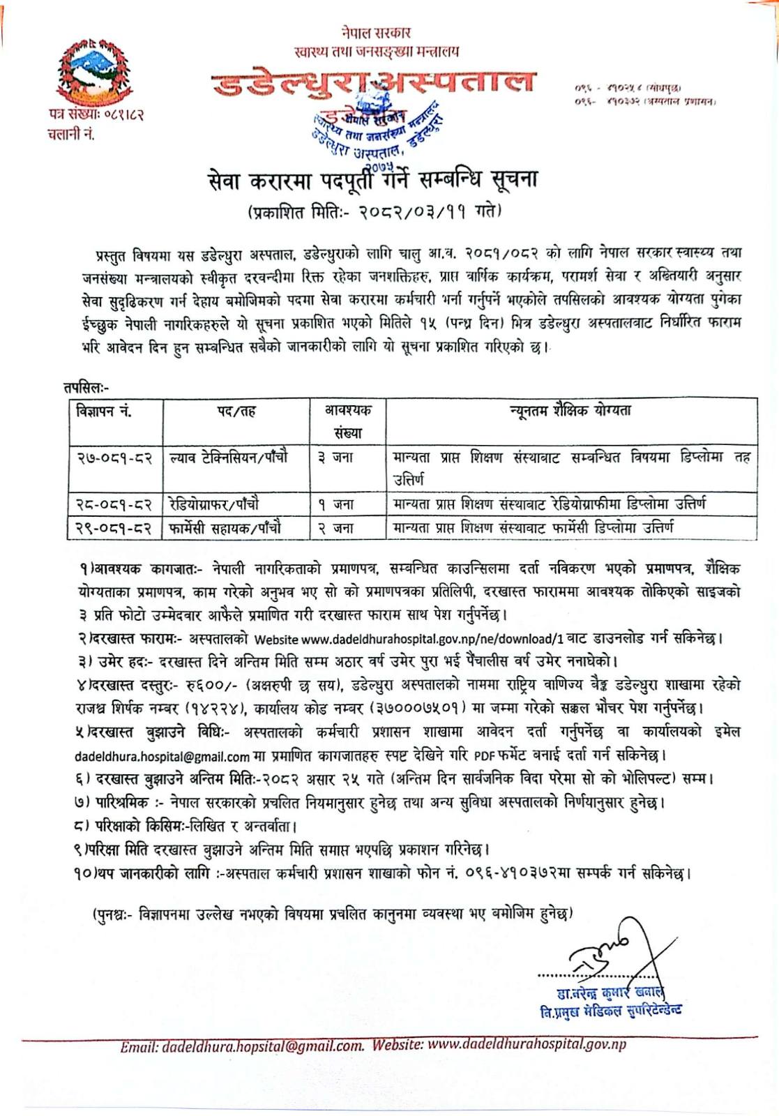 डडेल्धुरा अस्पतालमा सेवा करारमा कर्मचारी पदपुर्ती गर्ने सम्बन्धी सूचना