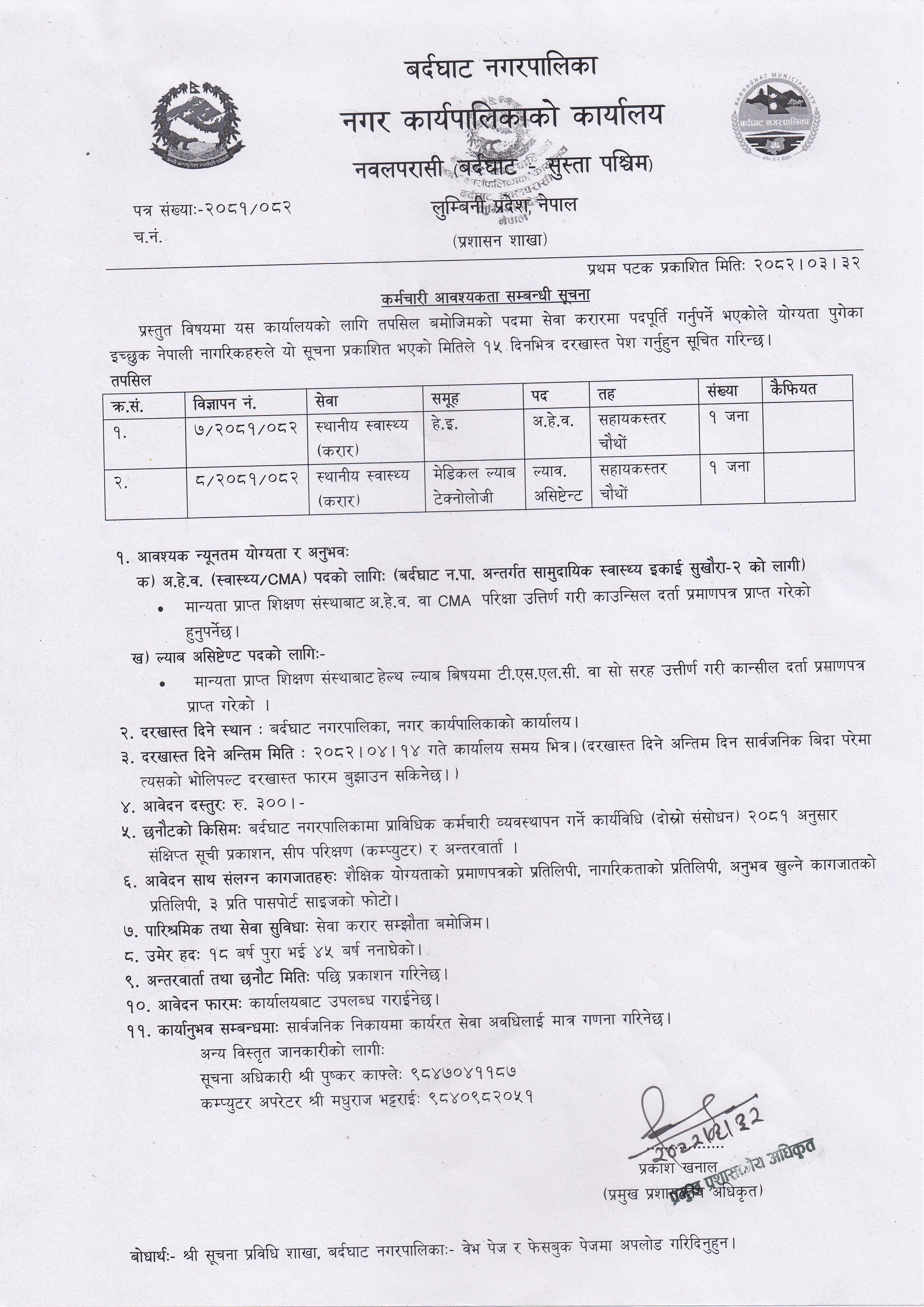 बर्दघाट नगरपालिकामा कर्मचारी आवश्यकता सम्बन्धी सूचना
