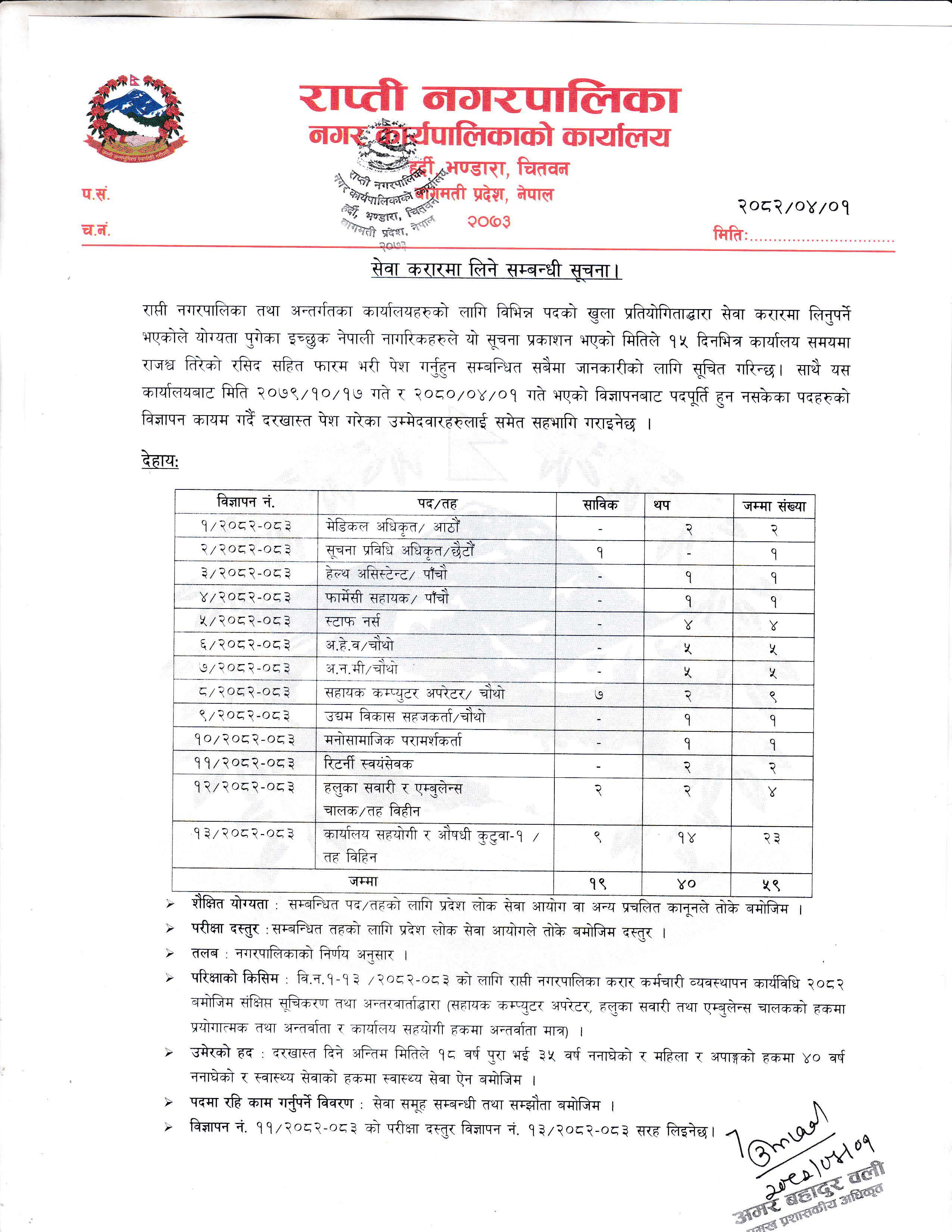 राप्ती नगरपालिका चितवनमा कर्मचारी आवश्यकता सम्बन्धी सूचना