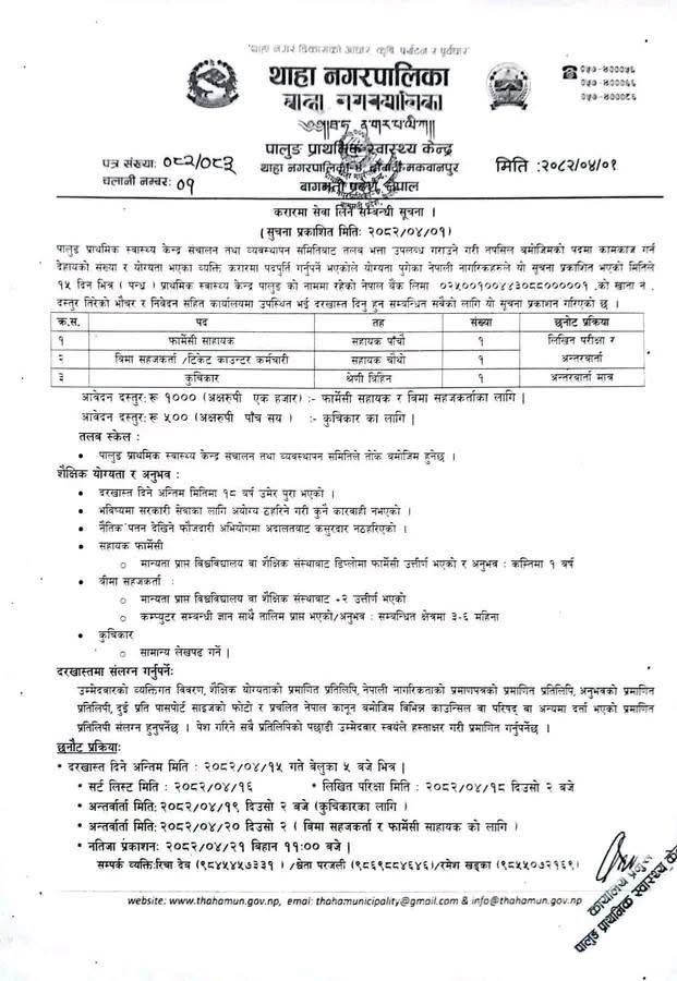 पालुङ प्रा.स्वा.के. थाहा नगरपालिकामा कर्मचारी आवश्यकता सम्बन्धी सूचना