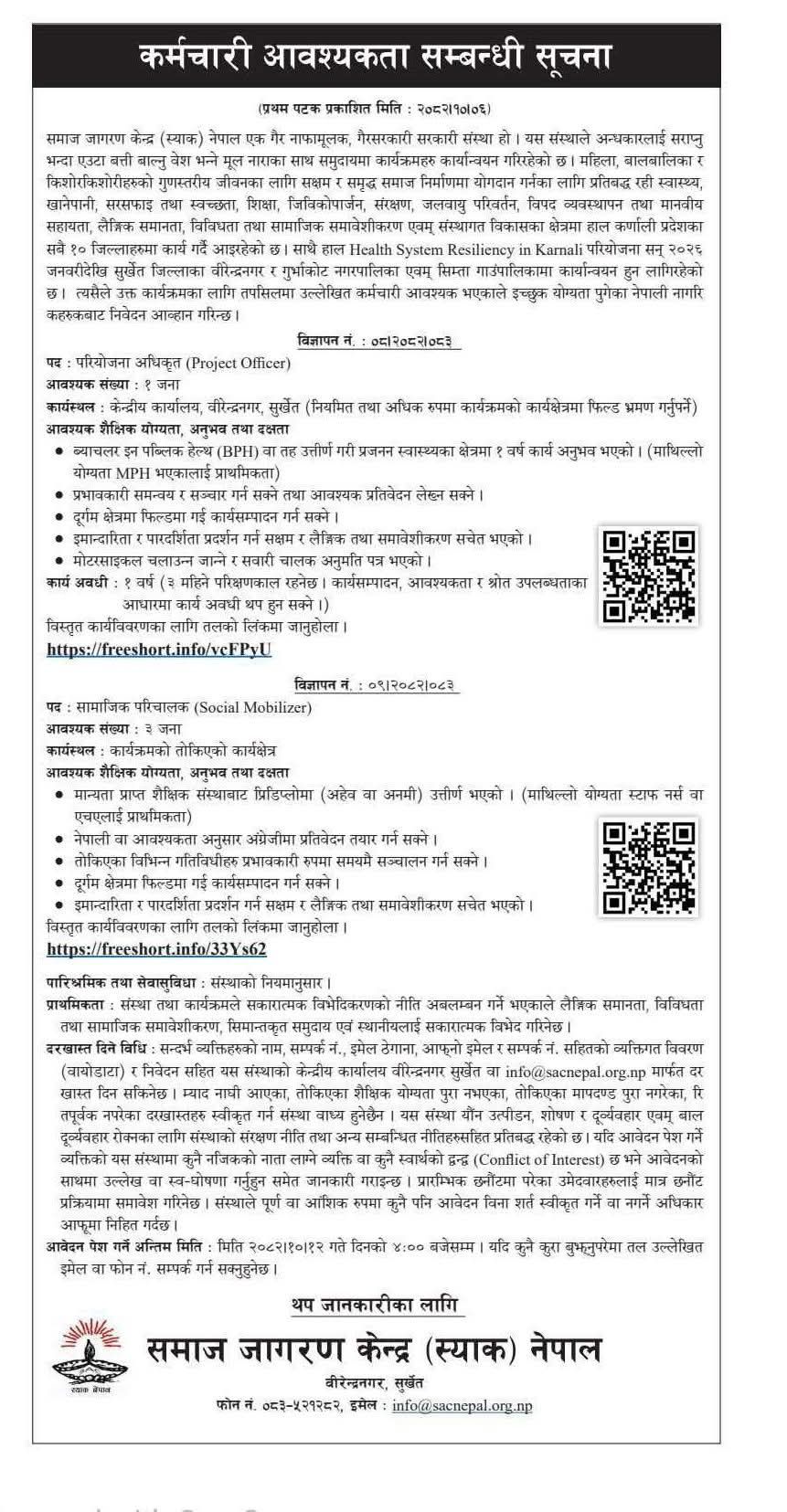 समाज जागरण केन्द्र (स्याक) नेपाल बीरेन्द्रनगर, सुर्खेतमा MPH, BPH, HA, Nurse, AHW, ANM आवश्यकता