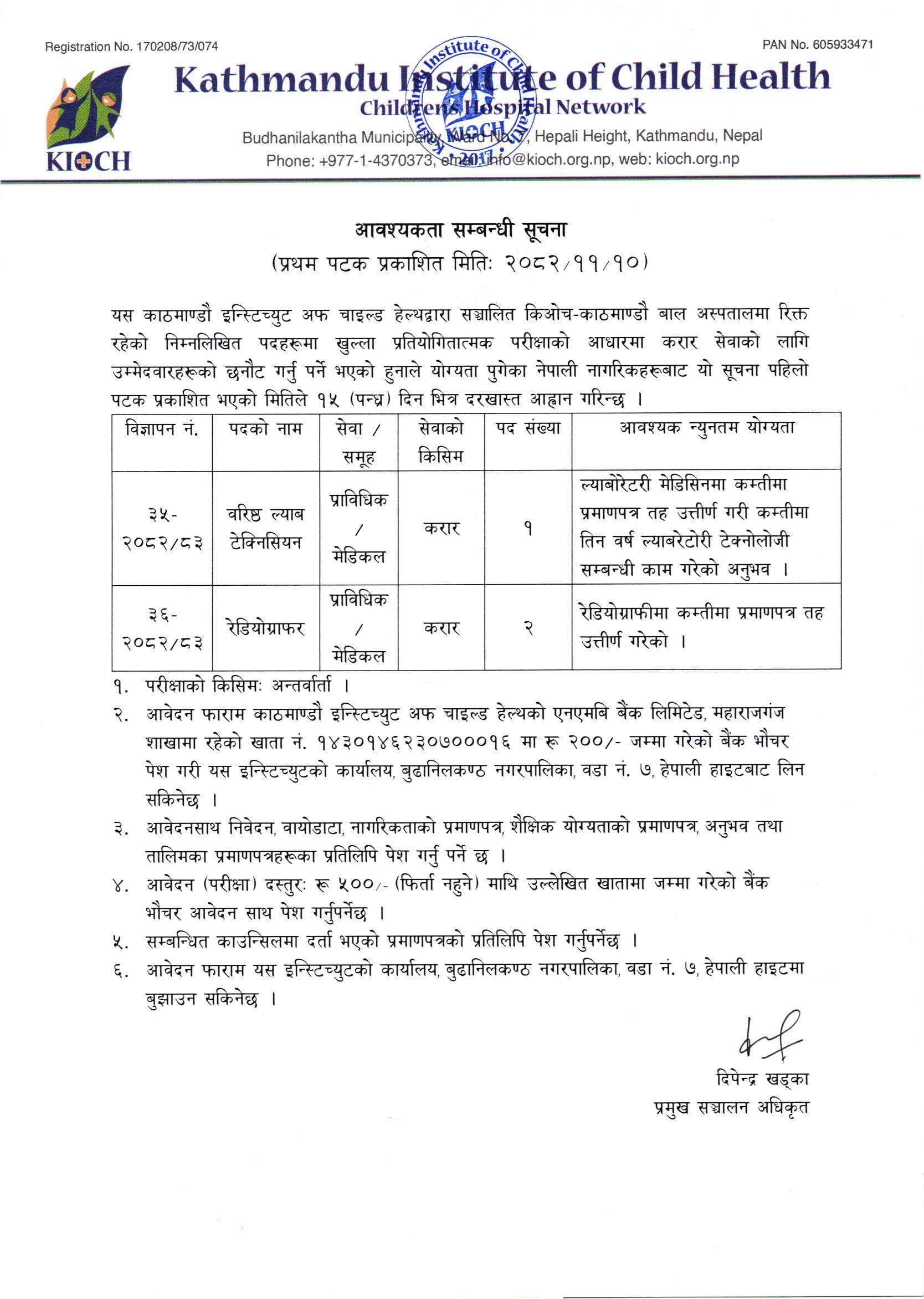 Vacancy Announcement for Sr. Lab Technician and Radiographer for KIOCH-Kathmandu Children’s Hospital