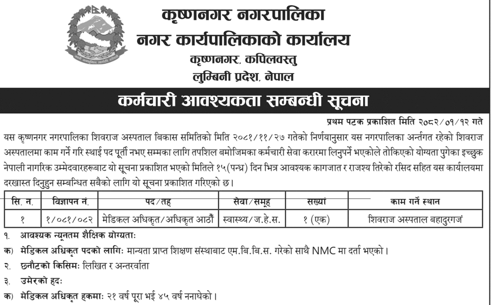 राप्ती प्रादेशिक अस्पताल, तुलसीपुर दाङमा कर्मचारी आवश्यकता