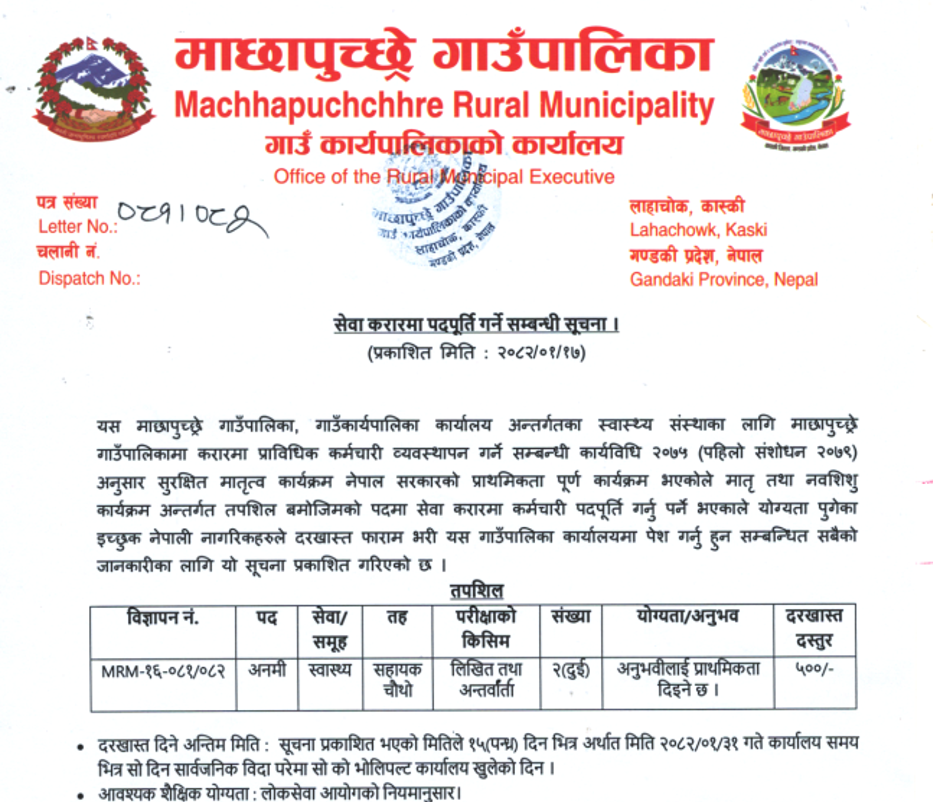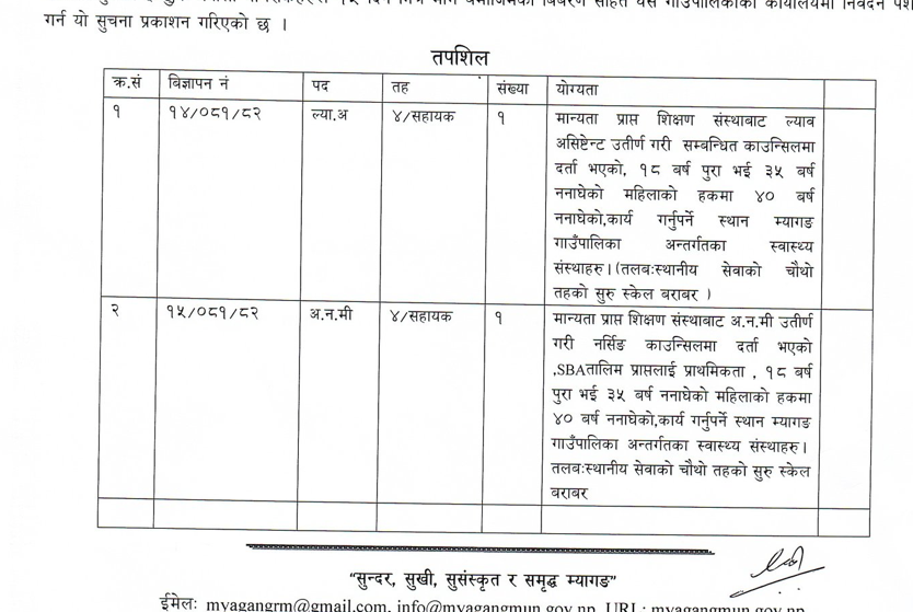 म्यागङ गाउँपालिकामा कर्मचारी आवश्यकता सम्बन्धी सूचना