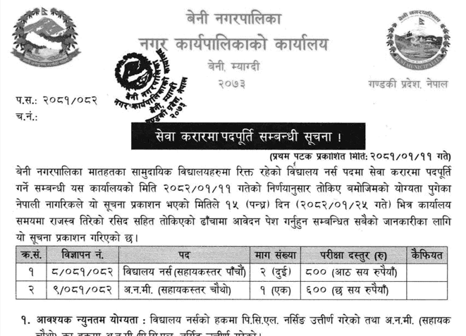Beni Municipality Vacancy for School Nurse and ANM
