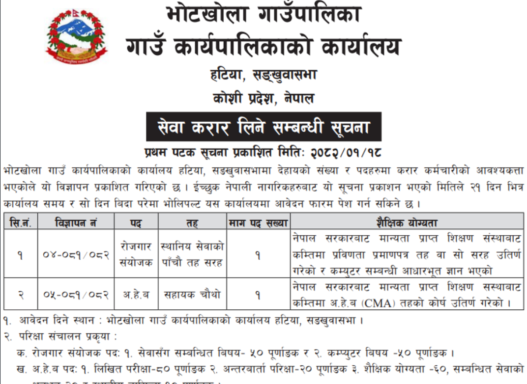 भोटेखोला गाउँपालिकामा कर्मचारी आवश्यकता सम्बन्धी सूचना