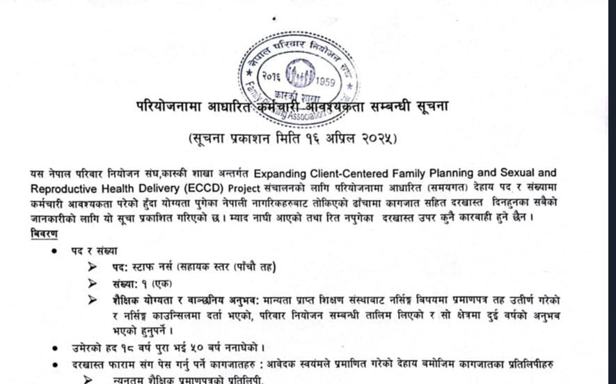 अ.न.मी सहायक स्तर चौथो पदको लागि सेवा करारमा लिने सम्बन्धी सूचना