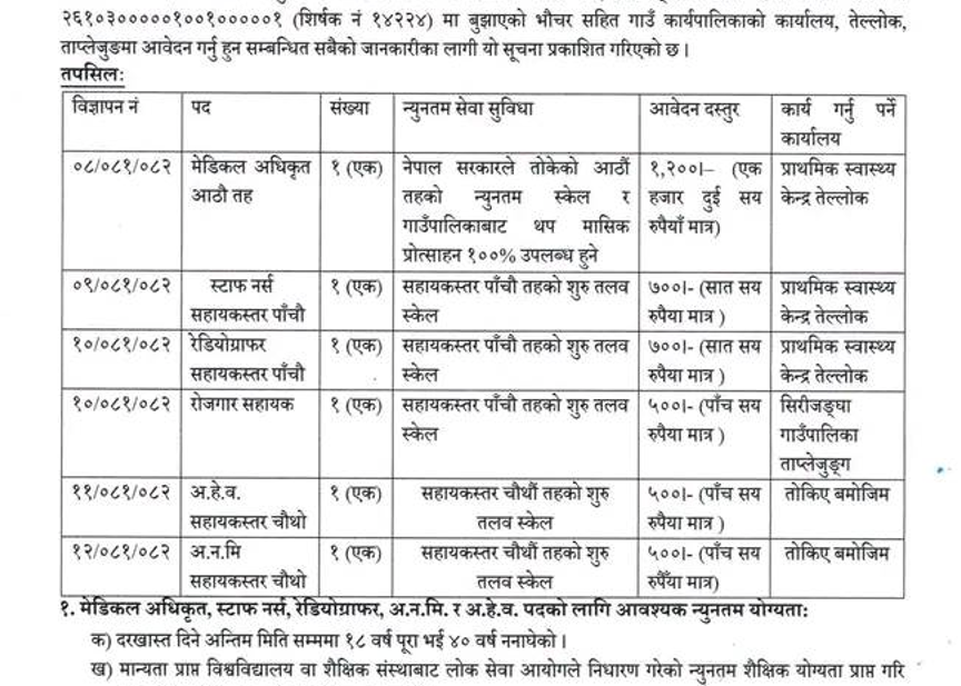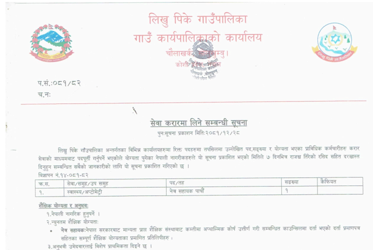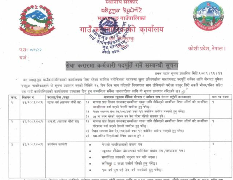 महाकुलुङ गाउँपालिका सोलुखुम्बुमा कर्मचारी आवश्यकता सम्बन्धी सूचना