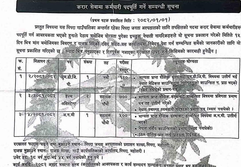 Pipra Rural Municipality Vacancy for MDGP, HA, ANM