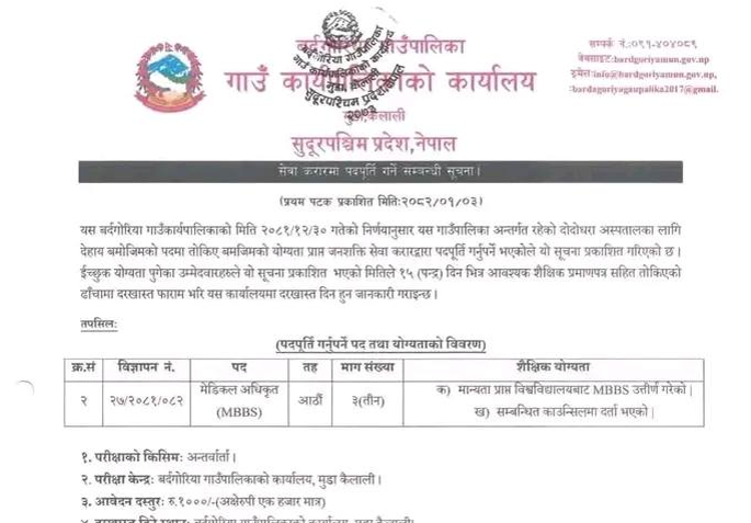 बर्दगोरिया गाउँपालिकामा मेडिकल अधिकृत आवश्यकता सम्बन्धी सूचना