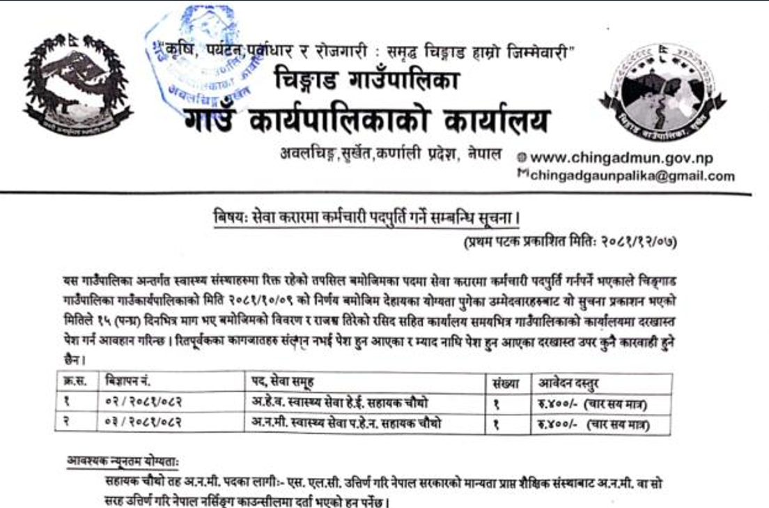 चिङ्गाड गाउँपालिकामा अ.हे.व./अ.न.मी. आवश्यकता सम्बन्धी सूचना