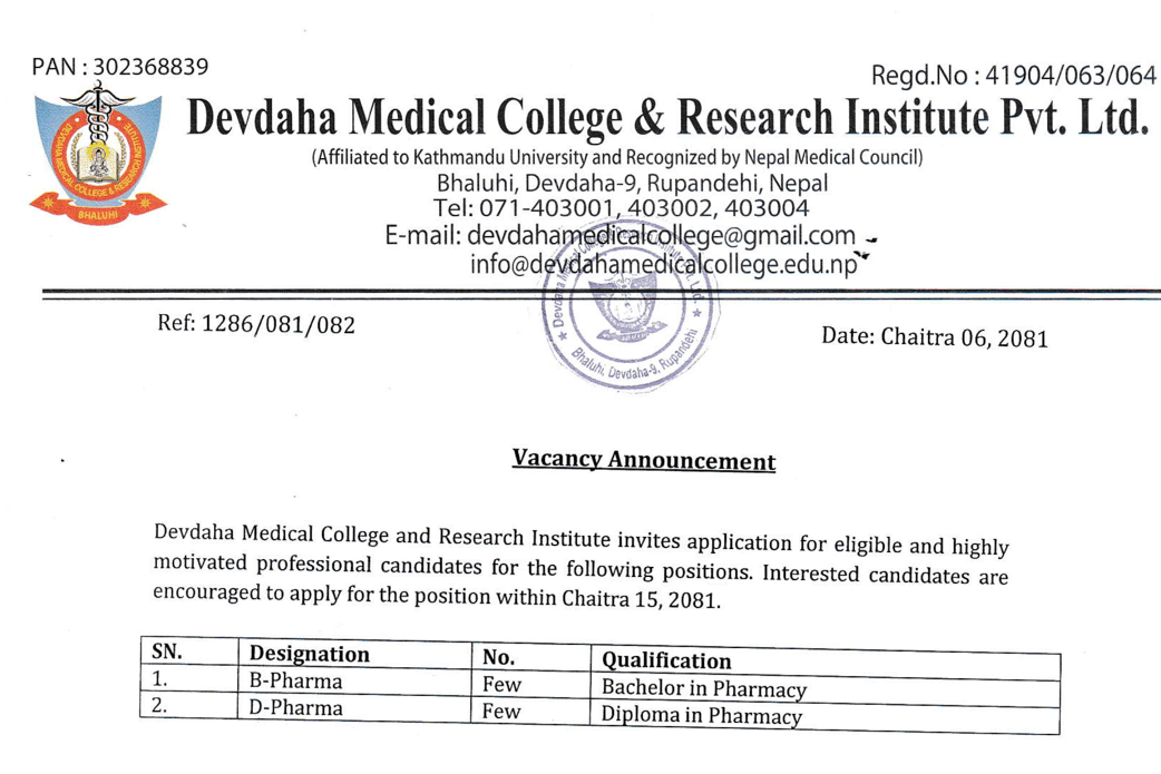 Vacancy Announcement for the Post of B-Pharma and D-Pharma at Devdaha Medical College & Research Institute Pvt. Ltd.