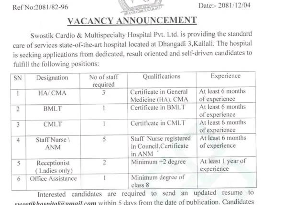 Vacancy Announcement for the various Post at Swostik Hospital Pvt. Ltd.