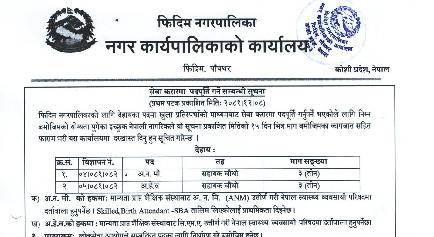 फिदिम नगरपालिकामा अ.हे.व./अ.न.मी. आवश्यकता सम्बन्धी सूचना