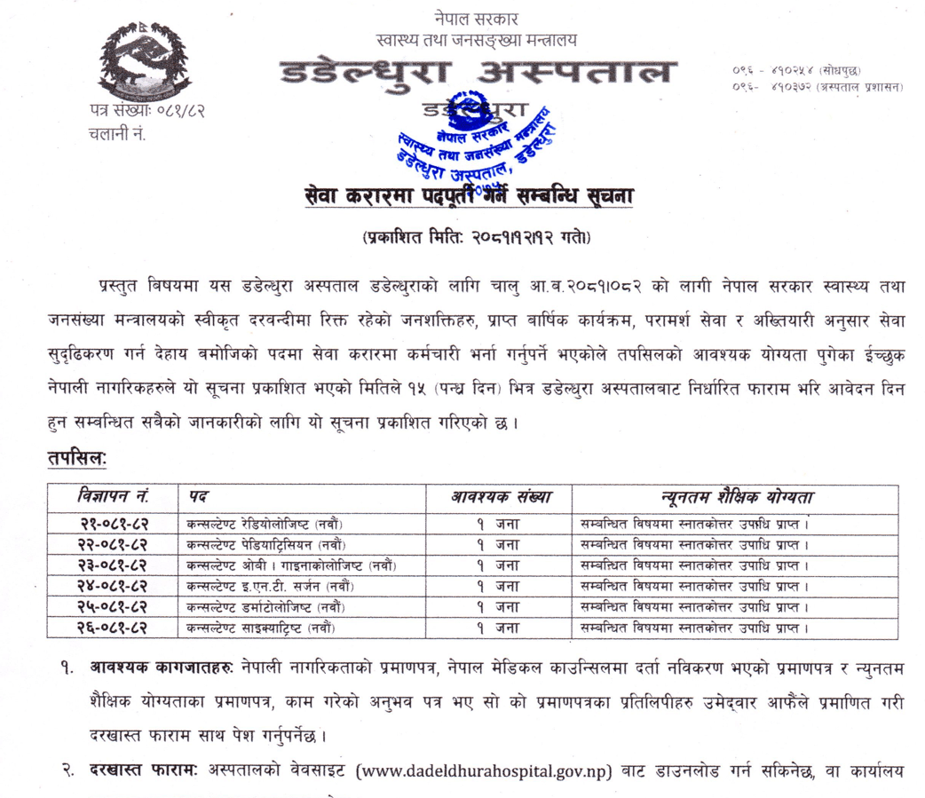 Vacancy Announcement for the various Post at Dadeldhura Hospital